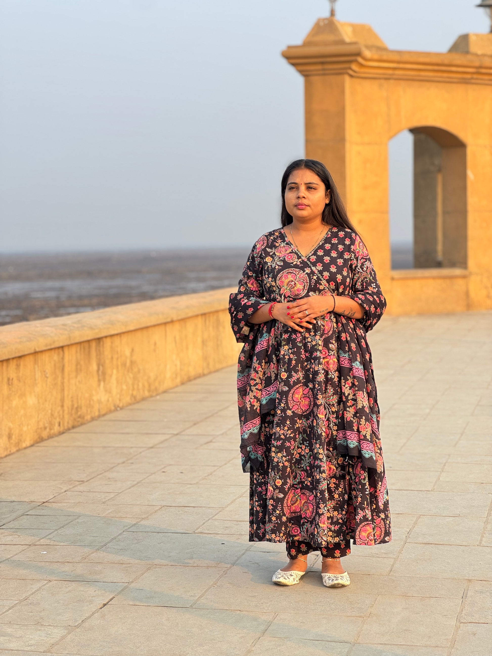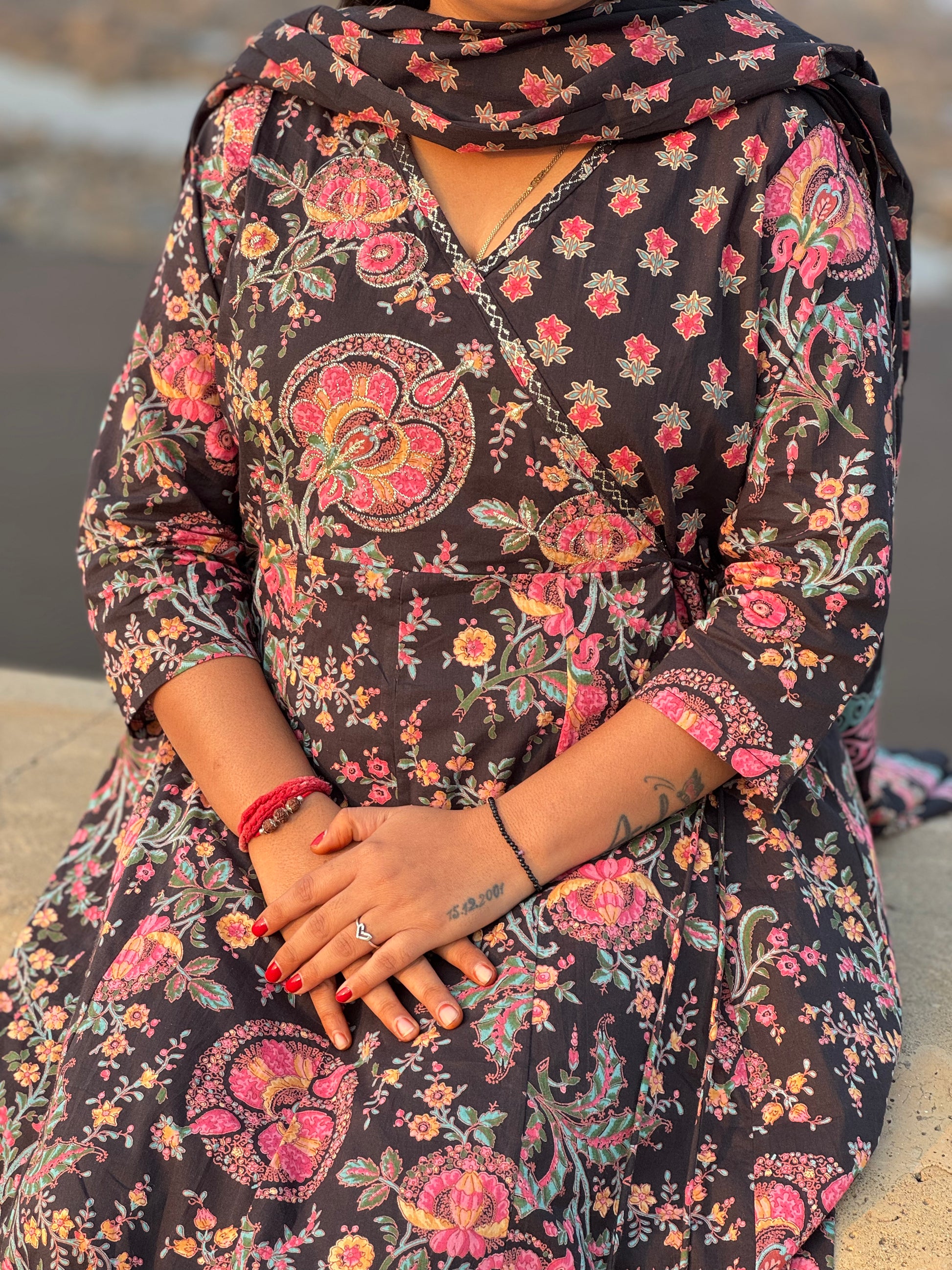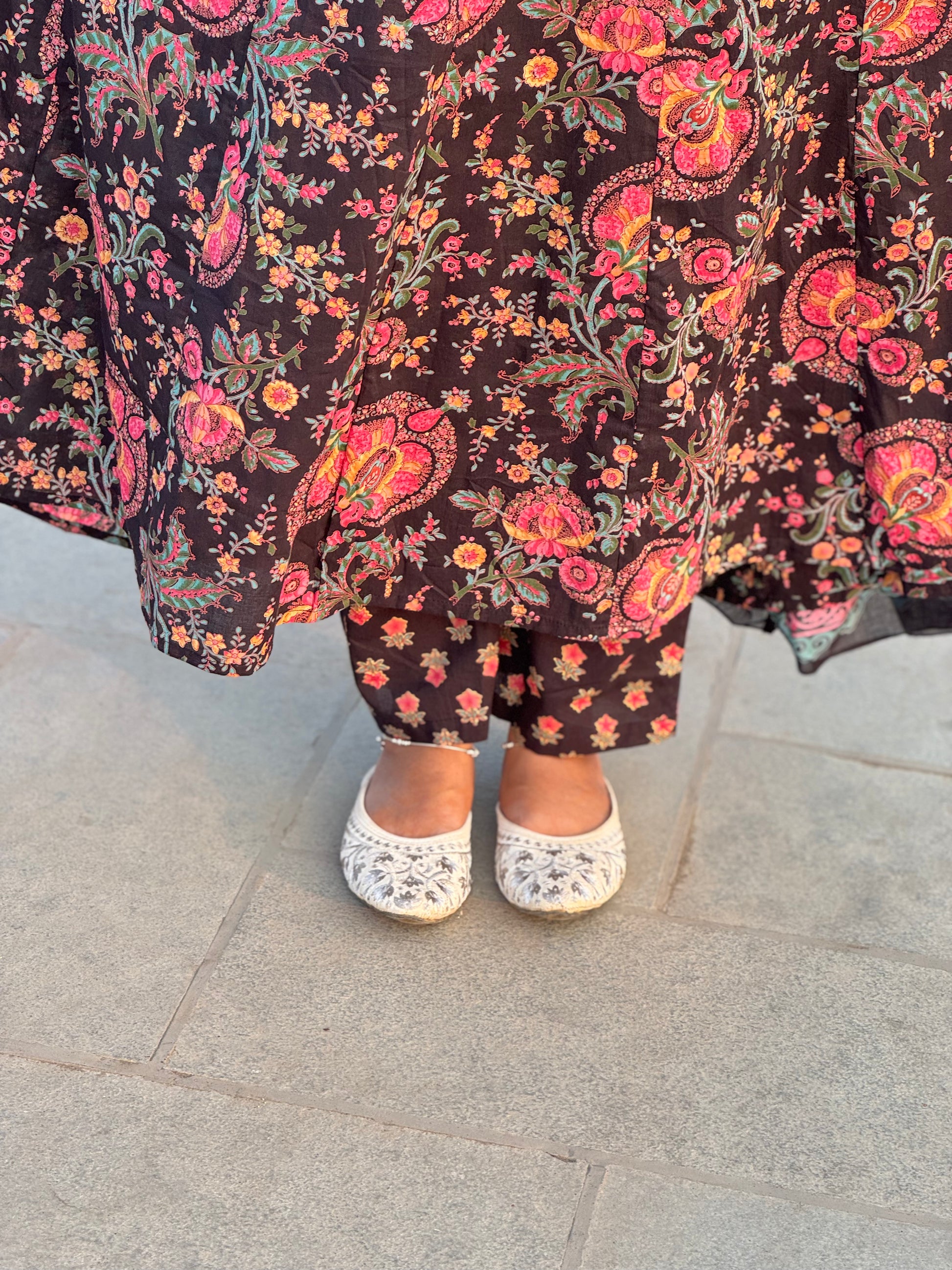 Floral Printed Black Anarkali Premium Semi-Partywear Cotton Suit.